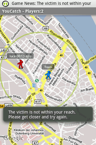Another game that comes with JOYity, YouCatch, is a version of Manhunt. Players in the same city sign up for a game. Everyone acts as both hunter and hunted at the same time. The game assigns you a player that you are hunting, while assigning you to someone else as a victim. Everyone’s location is periodically flashed on the map. When you get within 25 feet of your victim, you press the scrollball on the phone for the kill. But every time you press the button, your location is shown to all the other players as well. The last person standing wins.