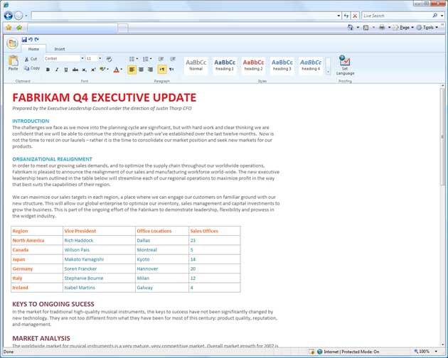 We had guessed earlier this year that Microsoft would choose the Silverlight platform to deliver Office online, but Microsoft will instead be copying the Google approach – the applications will be 100% HTML and Javascript. Update: The application will be offered in both Silverlight and HTML/Ajax – if it detects Silverlight on your computer, it will launch there.