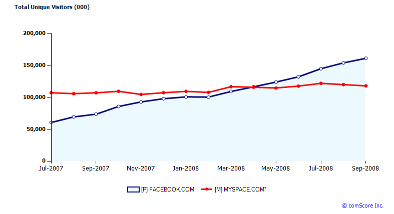 Facebook blew past MySpace in visitors from across the world back in April, but the global gap continues to widen. According to the latest figures from comScore, Facebook attracted 161.1 million unique visitors worldwide in September, compared 117.9 million for MySpace. For Facebook, that number was up from 4.7 percent from the 153.9 million people who visited the social network in August. Visitors to MySpace declined 1.6 percent globally from 119.8 million.