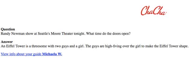 Some fairly funny answers occasionally come back from the human guides, who early on at least had to deal with a lot of prank queries. But none of the ones we’ve seen compare to the one to the right, which is a Digg favorite tonight. It describes the Eiffel Tower sexual position (yes, you learn something new every day) in response to a completely unrelated query about a Randy Newman show in Seattle.