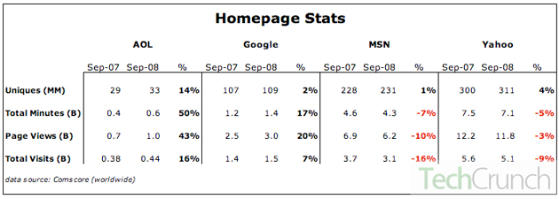 AOL, the smallest of the big four portals (if you care to call Google a portal), has had significant homepage growth over the last year. Unique visitors have grown 14% to 33 million, total minutes on the site have grown 50% to 600 million, page views are up 43% to a billion, and total visits have increased 16% to 440 million (Comscore worldwide). Stats for the competitors are below. Everyone is up at least a little in unique visitors, but page views, total minutes and total visits have declined at MSN and Yahoo.