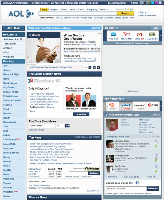 Today they launch the rest of the new features (we had a leaked screen shot here). Users can log into social networks (Bebo, MySpace, Facebook and AIM) to view news feeds and update status. Bookmarks can be added to the top left of the page, and a feed reader is included at the bottom of the screen. AOL is also inserting direct inks to third party news sources via Relegence, a company they acquired in 2006 and began integrating into AOL Finance in late 2007.