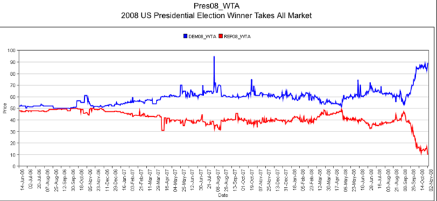 The NYT also has a nice interactive graph that shows all the major poll results and how they’ve changed over time. Again, I trust markets over polls any day, and it is interesting to note that in another Iowa Electronic market predicting the share of the vote each candidate will get, it is predicting a closer race than even Fox. Right now, it has Obama winning 53 percent of the vote compared to 47 percent for McCain.