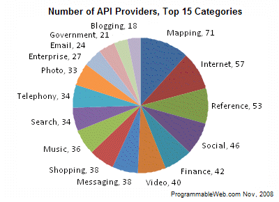 The site also mocked up some graphs from their API database. For example, here is a rundown of the top 15 sectors or markets with the greatest number of competing API providers. Mapping seems to be the most popular, while you would expect video, search, photo, social and music to score higher. The smallest number is even more telling: it’s APIs for blogging.