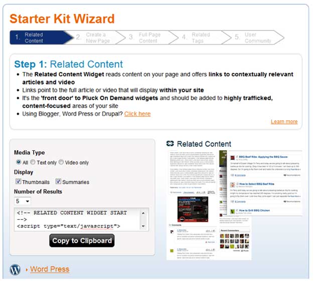 Second, Pluck on Demand is widget based and much easier to implement than Blogburst. Pluck on Demand users can add widgets that show interesting content in summarized form, a widget to show full articles that are clicked on, a widget for user comments and another widget to show browsing/search results.