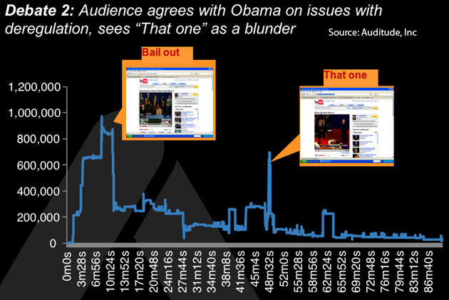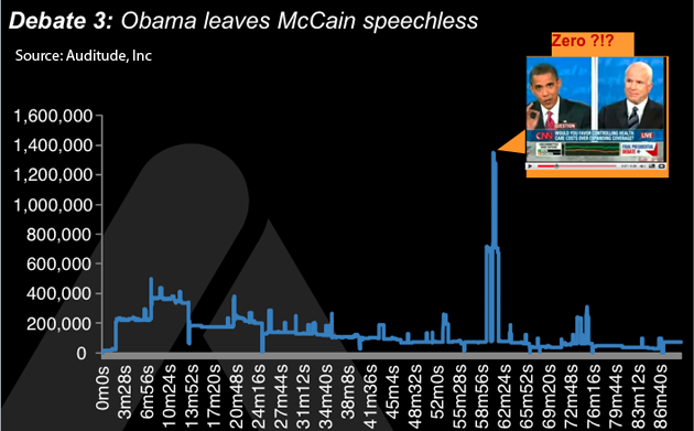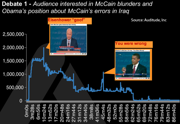For its initial analysis of the election, Auditude has mapped out the popularity of each moment in this year’s three presidential debates. Crawling across sites like YouTube, Veoh, MySpace, and Yahoo, the site isolated several thousand videos depicting portions of each debate, and then laid them out in a timeline to determine which moments were the most viewed.