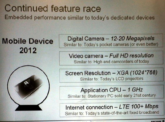 Ericsson has big plans for cell phones – big plans. Ultimately by the 2012, the company sees 100+ Mbps connection with 12-20MP cameras as you can see by the chart above. Plus, your lowly phone will be able to record HD video and sport a 1GHz CPU. So in less than four years all this is suppose to happen, Ericsson? M’kay. The megapixal camera is within reason, and even the HD video part doesn’t seem that wacky within four years, but while Euro snobs and Japanese tech geeks might see the fast data speeds, chances are we here in the States will not see those quick speeds before flying cars.