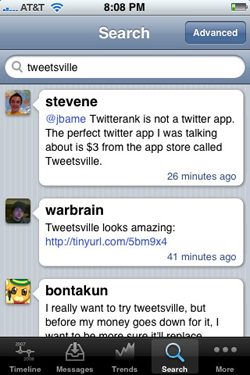The company’s new Twitter client is called Tweetsville (grab it here for $3.99), and was developed by veteran engineer Ed Voas. CEO Bart Decrem says that Voas initially started building the app for himself after becoming dissatisfied with existing Twitter clients, and incorporated a number of key features that make Tweetsville an ideal app for Twitter power-users. The application includes an integrated listing of top trends, advanced search functions, and a streamlined interface that feels much speedier than its competitors. In short, it’s great, and I won’t be surprised if it displaces favorites like Twitterific and Tapulous’s own Twinkle as the premier Twitter client on the iPhone. Decrem says that Twinkle will now focus on connecting people who are close to each other while still functioning as a Twitter client, while Tweetsville will be for hardcore users.