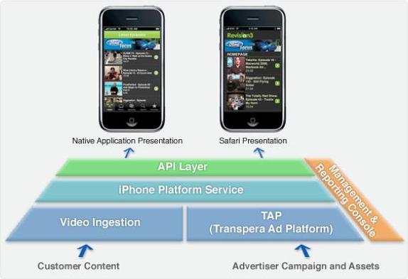 Transpera has developed a platform that enables the distribution and monetization of Web videos on mobile phones. With the so-called Transpera Ad Platform (TAP), the company offers mobile video publishers and carriers a suite of promotional and distribution building tools to enhance the end user experience, and advertisers a way to market their wares by serving targeted ads in the form of interactive display banners, pre-roll videos, overlay ads, post-roll experiences and mini sites. There’s even a spin-off platform tailored specifically to the iPhone (screenshot of the model below), which makes sense given the fact that web browsing and entertainment is quite popular on the device.