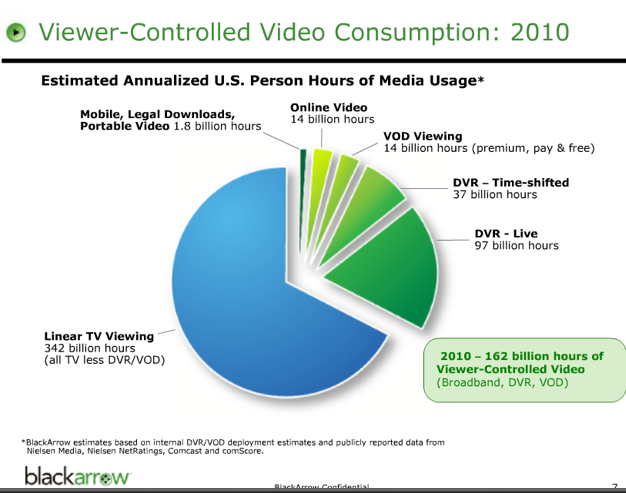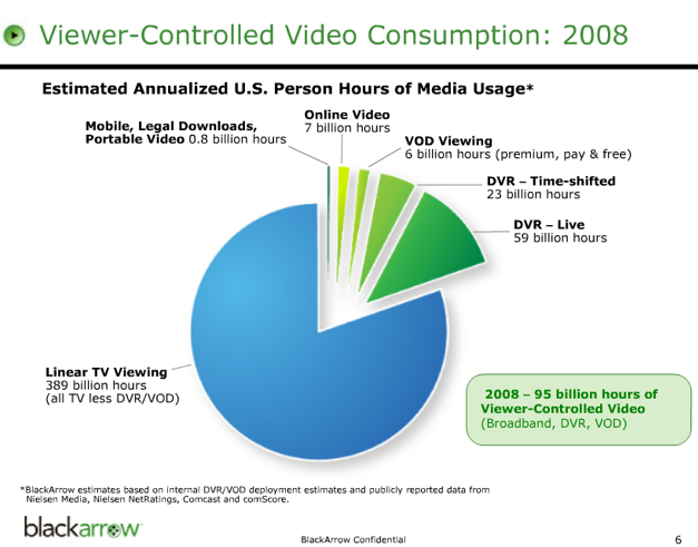 Here’s a slide Denhart likes to show that puts things into perspective. In 2008, he estimates that people in the U.S. watched 389 billion hours of plain old TV. That compares to 95 billion hours of on-demand TV, which he breaks up into live DVR (59 billion hours), time-shifted DVR (23 billion), cable and satellite video-on-demand (6 billion hours), online video (7 billion hours), and digital downloads (800 million hours). So of all 484 billion hours people will spend watching video in the U.S. this year, only 1.4 percent will be online video.