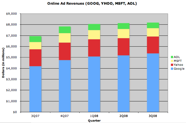 For the purposes of this analysis, I took the total advertising revenues from both Google and Yahoo, including their network revenues paid to affiliates, the online revenues reported by Microsoft, and only the advertising portion of AOL’s revenues. There were other companies I could have added, but these four serve as good proxy for the overall online advertising market. Below are the absolute revenue numbers, broken down by company: