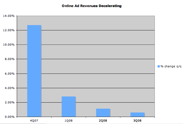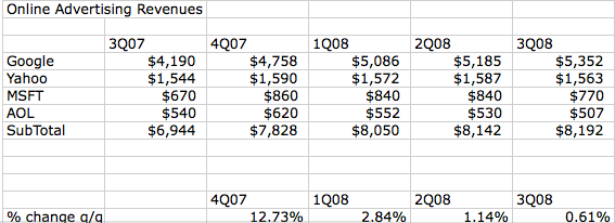 On an absolute basis, the combined ad revenues for all four companies during the third quarter increased by only $50 million to $8.2 billion. The year-over-year growth rate was still a healthy 18 percent, but those comparisons will likely flatten out as well starting in the fourth quarter.