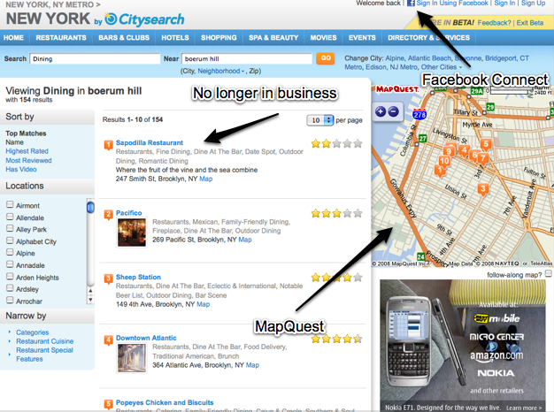 Citysearch is finally coming around to replacing its creaking site design with something a little more contemporary. Today, it is launching in a major rethink of its entire site in beta that drills deeper into neighborhoods, uses Facebook Connect as an optional identity system, and lets users vote reviews up and down. The beta will quickly become the default Citysearch experience. During a demo at IAC headquarters yesterday, Citysearch CEO Jay Herratti told me: