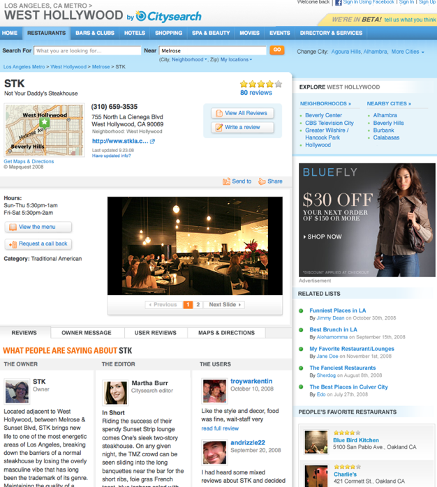 1. Hyper-local content. Citysearch is currently organized by city, so no matter what neighborhood you are looking at you get the same city guide. With the beta, Citysearch has mapped each city by neighborhood and placed each restaurant, bar, hotel, theater, or other local business in a specific neighborhood. So now when you are looking for things to do in a given neighborhood, Citysearch can dynamically create a neighborhood guide complete with restaurants, shops, and other businesses. With this one change, Citysearch is going from 140 cities to 75,000 neighborhoods by the end of the year.