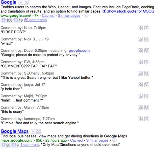 We’d noticed an increasing number of people emailing on a large-scale bucket test (a product change tested on just a percentage of total users) that Google has been conducting for months – adding a Digg-like voting feature to search results (which also changes the ranking) as well as user comments.
