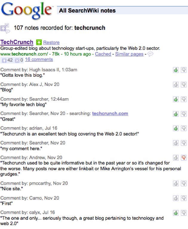 The changes Google made to search today certainly make it more interactive and social. I can now write comments on search results, and read comments from everyone about TechCrunch (or anything else – see the awesomely useful TechCrunch comments in the image below, along with my votes on each) and vote them up or down. I can move search results around on the page – up, down, or off the page entirely. I can also add other URLs into search results.