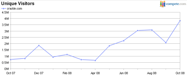 Crackle used to be Grouper, before Sony bought the startup for a reported $65 million in the Summer of 2006. The Reuters report cites 2.4 million visitors in October, according to research firm The Nielsen Online Co., while Compete shows higher number and a nice growth pattern.