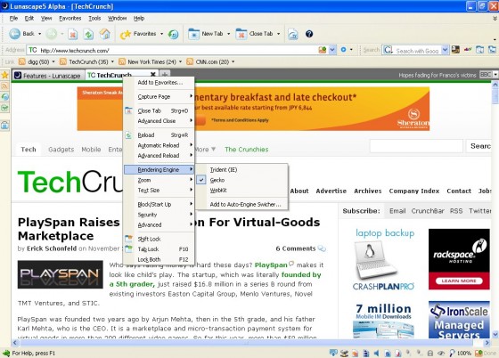 This is how Lunascape works: Users can toggle between rendering engines by either right-clicking tabs or by clicking on the engine switcher button on the bottom left of the screen. If you have figured out which engine works best for a page, Lunascape lets you force the page to use that engine for future visits via a pull down menu (Lunascape CEO Hidekazu Kondo calls this “semi-automatic” engine switching).
