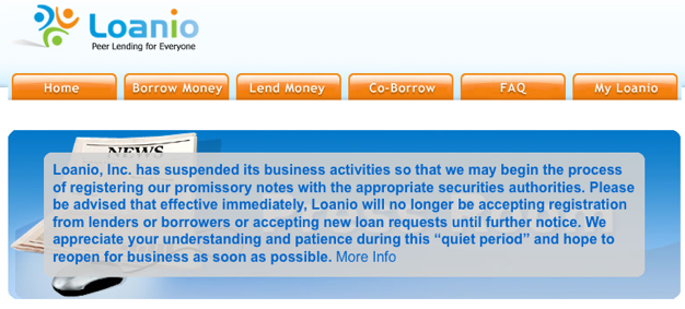 And it is not just Prosper, but all P2P lenders, that are on notice. Loanio, a new entrant into the P2P lending arena that just launched last month, has suspended new loans until it registers with the SEC as well (see notice below). And last April, competitor Lending Club was the first P2P lender to temporarily cease operations (the SEC approved its registration, and its members are now lending again in about half the states, including California which gave it the go-ahead last week).