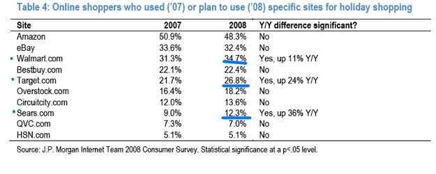 When it comes to online shopping sites, Amazon still rules, but Walmart and Target are catching up. About 50 percent of online shoppers say they will shop this year at Amazon, compared to 35 percent at Walmart.com, 32 percent at eBay, and 27 percent at Target.com. In fact, this year could be the first one where Walmart.com surpasses eBay in total number of online shoppers. The survey also indicates that Sears.com could see a 36 percent increase in shoppers. (Maybe that’s why the site went down today).