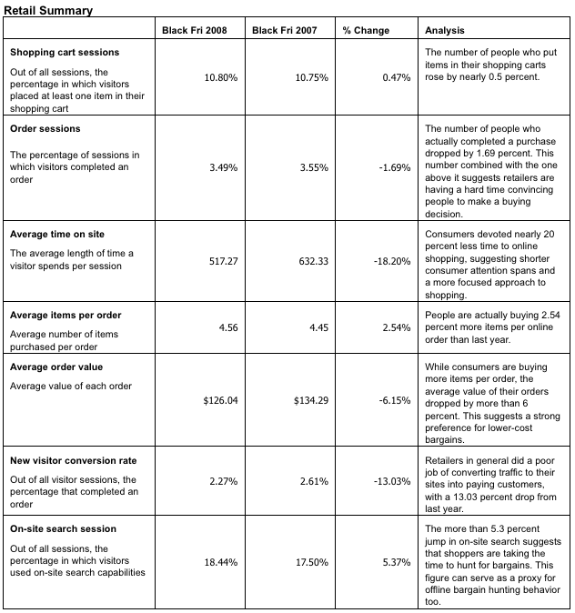 Update: Below is some more data from Coremetrics showing flattish activity at retail sites on Black Friday. Coremetrics tracks 300 retail Websites in detail, including shopping cart and order activity. Orders were completed in 3.5 percent of all sessions, about the same as last year, but the average order value ($126) was down 6.15 percent. Here are some of Coremetrics’ findings: