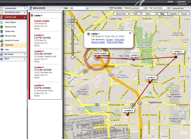 Laptop Cop costs $50. It does come with those other features as well. But if you want the same Lojack service for your laptop without paying, you can download MyLoki for free. It is a browser add-on from Skyhook that broadcasts the location of your laptop. And anyone can always check your personal MyLoki page to see where your is laptop (which is supposed to be a proxy for you, but not when it’s been stolen).