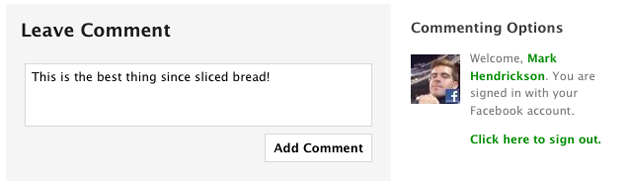Hooking things up with Facebook also lets us display your profile portrait in miniature form next to your name in the header of comments. Your name conveniently links to your Facebook profile as well, making it easier for other commenters to get in touch with you and perhaps become your virtual friends.