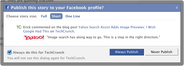 But Facebook Connect doesn’t let information flow just one way. You can now post notifications of your comments to your Facebook wall whenever contributing here on TechCrunch. After hitting the “Add Comment” button, just select a type of feed item (which Facebook calls a “story”) and your friends on Facebook will have the chance to appreciate your snark and wit.