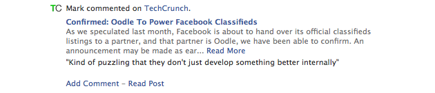 There’s a lot more that can be done with Facebook Connect to enhance the social aspects of TechCrunch, so expect to see more elaborate Facebook-enabled features in the future, such as the ability to see which of your friends are also TechCrunch readers. In the meantime, try this implementation out and let us know what you think in the comments (naturally). Suggestions about how we should expand our usage of Facebook Connect are also most welcome.