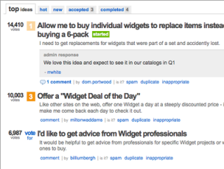 Billing itself as an ‘online suggestion box that sorts itself’, UserVoice enables companies to embed widgets onto websites and applications to sollicit feedback from users in combination with a Digg-like voting feature. The idea behind that approach is that it’s easier and more scalable to crowdsource user opinions, ideas and suggestions than other ways of communication.