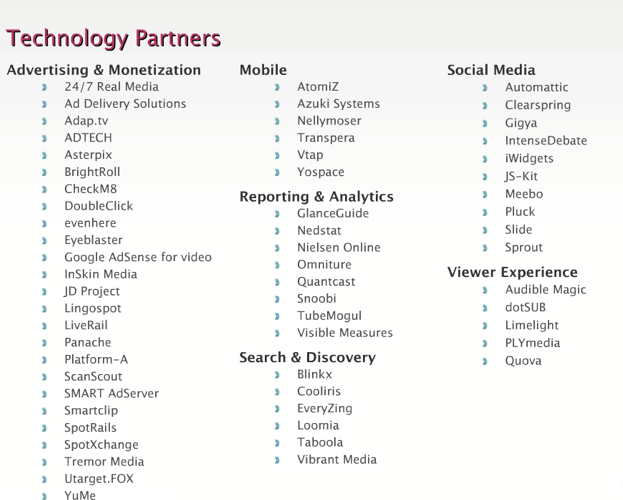 Web video platform Brightcove has so many API partners just two months after the release of Brightcove 3 that it had to create an alliance to contain them all. Actually, the Brightcove Alliance is more of a marketing exercise to acknowledge and promote its API partners. Nevertheless, nearly 100 companies (including Yahoo, AOL, DoubleClick, Veoh, Metacafe, Slide, Meebo, Blinkx, Sprout, Clearspring, and Visible Measures) have implemented the API in less than two months. (Update: In other news which we noted in our Layoff Tracker, the company let go 25 people last week, or 15 percent of its workforce. Brightcove still employs 147 people).