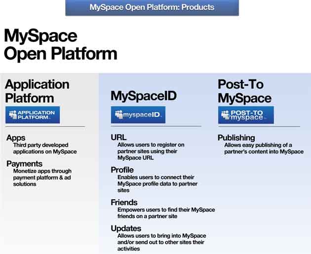 MySpaceID is roughly analogous to Facebook Connect, which had their own coming out party last week. Sites can add various elements of MySpace ID to allow their users to log in via their MySpace credentials, display their profile information, and find MySpace friends who are using those sites. Starting early next year, MySpace says, they will add the other features that Facebook Connect has now, such as publishing activities from partner sites to MySpace, and syndicating MySpace activities to partner sites. MySpace will also allow partner sites to take new user registrations beginning with their MySpace credentials and basic profile information.