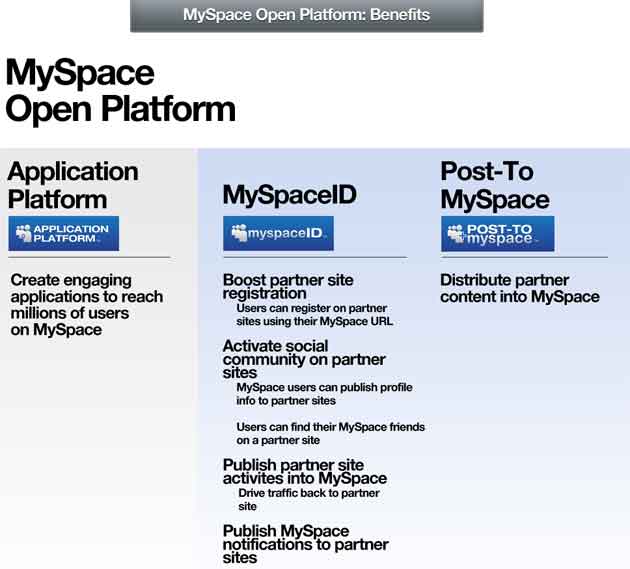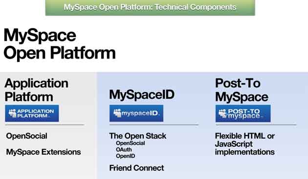 The crucial difference between MySpaceID and Facebook Connect is the software stack. Facebook uses proprietary software and methods, although they say they will open up over time. MySpace has embraced open standards across the board, including OpenID, OAuth and Open Social. The benefit, they say, is that sites will be able to implement other competing services that are also on the open stack with few implementation changes. Yahoo, for one, is rumored to be taking a similar approach.