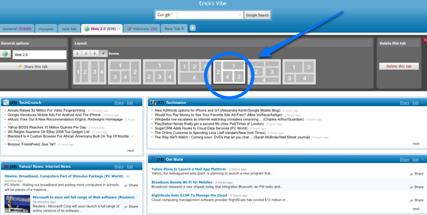 To change the layout of an entire page within Netvibes, you click on the option pull-down menu arrow on each tab and pick your layout. To change the layout of an individual widget, you click on “edit” within that widget, and then pick the view you want. (You can read more details on this Netvibes blog post). Netvibes pulls images from the feeds as well, although they tend to be a little fuzzy.