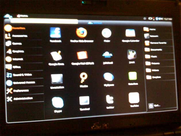 Jolicloud isn’t ready to launch yet. I did manage to track Tariq down for a few minutes here in Paris to get a demo, though, on a low end Asus Eee PC. He won’t yet share proper screen shots of the user interface, saying it isn’t locked down yet. But I did grab a couple of blurry photos with my phone.