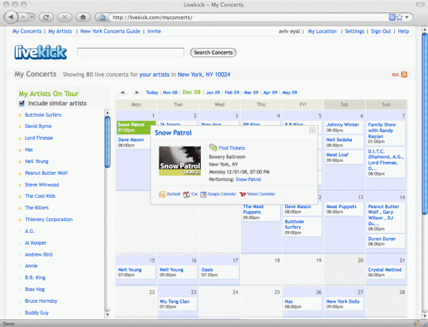 This is where LiveKick’s under the hood technologies start kicking-in, beginning with its live concerts search engine that continuously queries ticketing sites such as Ticketmaster, LiveNation, StubHub, Tickets.com and eBay, as well as user-generated content sites such as MySpace Music. The Livekick search engine performs daily updates of ticket pricing info for the 69,000+ concerts that it tracks in the US.