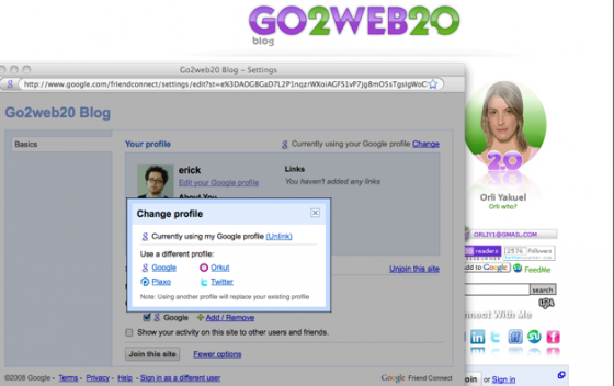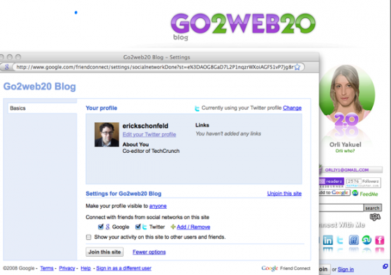 Friend Connect also supports IDs from Google, Yahoo, AIM, and OpenID. For instance, I tried this on the Go2Web2.0 blog, which has implemented Friend Connect, and it gave me the option to use my Gmail or Twitter accounts (I could also use Orkut or Plaxo). I used my Twitter sign-in without a hitch. (Update: Actually, this is a little confusing, but it signs you in first using one of the four credentials above and then asks you if you want to add Twitter).