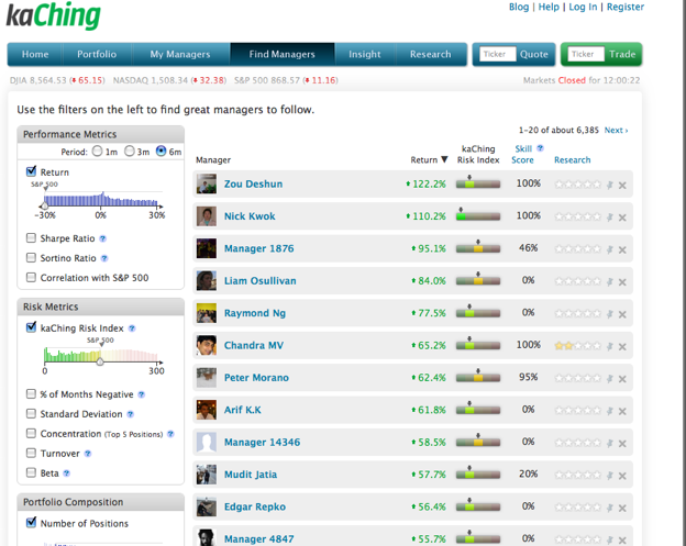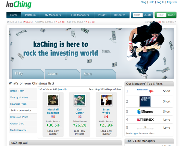 In some respects, kaChing is the most extreme example of pure social investing. Cake and Covestor both track real trades in real portfolios, whereas anyone can create a fantasy portfolio on kaChing. There are absolutely no barriers to entry. CEO Dan Carroll argues this is a good thing because you could be a brilliant investor but not have the money to actually trade. KaChing levels the playing field.