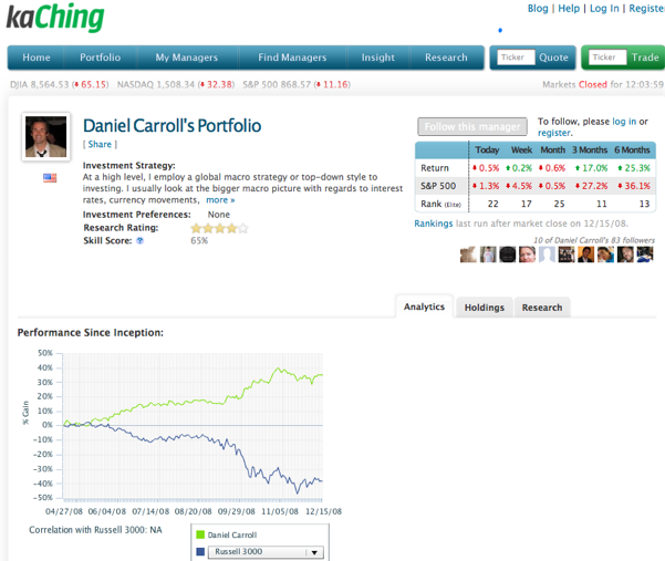 Of the 350,000 portfolios on kaChing, 20,000 (1,500 of which are diversified portfolios) have actually generated positive returns over the past seven months, which is no mean feat. The idea that a tiny percentage of kaChing’s members can beat the market is really appealing, and I hope that Carroll is right. But we need more data. How many of those 20,000 can stay in positive territory, or even just beat the market?