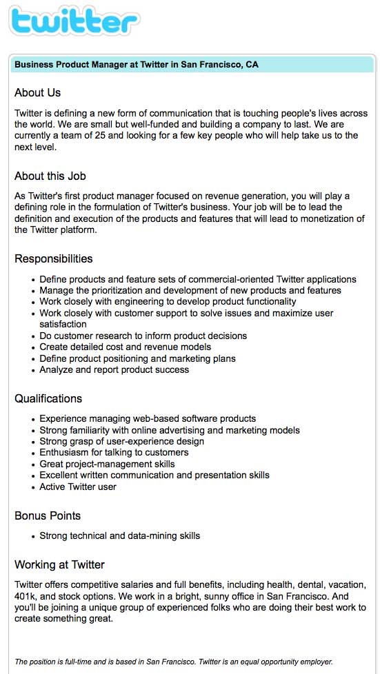 But now’s obviously the time. Twitter recently posted a Product Manager job description at Jobscore.