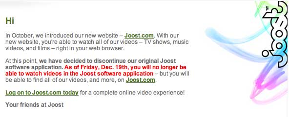 Today they announced they’re discontinuing the software application altogether, but they aren’t saying why. It’s clear that Joost’s strategy has been fluid over the last few months as they try to figure out a way to compete with the much more successful Hulu. It’s honestly not clear that they really can. Joost doesn’t offer anything particularly unique or compelling to users over competing sites with proprietary content (Hulu with Fox and NBC, TV.com with CBS).