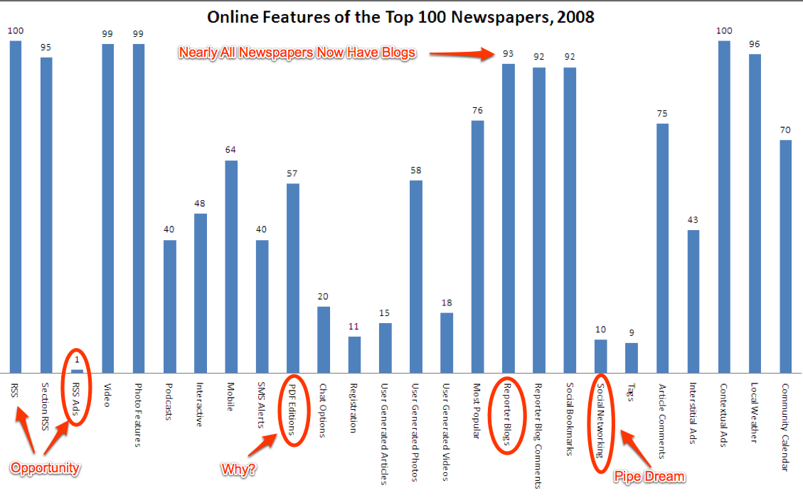 You can pretty much see all of the findings in two graphs, which I’ve marked up. (Click on the images for a larger view). In the one above, which shows the penetration of all the online features on newspaper sites, 93 percent have reporter blogs and 100 percent offer articles in RSS feeds. Yet only one percent put ads in those RSS feeds. That seems like an opportunity, even though most RSS ads are complete garbage and readers hate them.