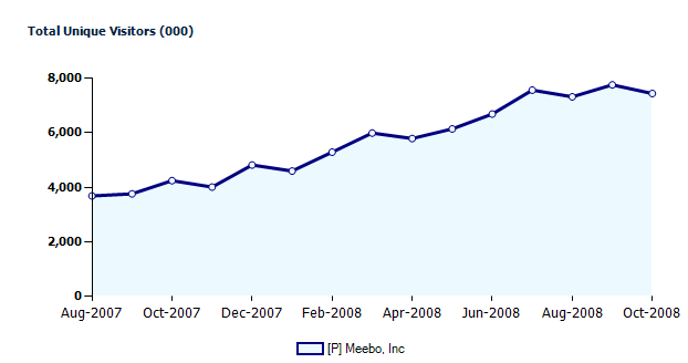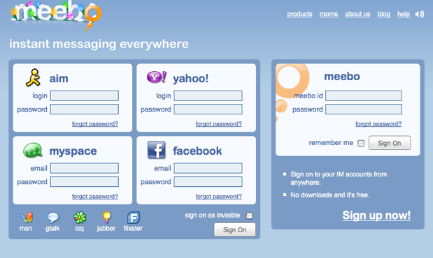 Meebo also supports AIM, Gtalk, MSN Messenger, Yahoo Messenger, Jabber, and ICQ accounts. It claims 40 million members, who send 5 billion messages a month. ComScore reports 7.4 million monthly visitors worldwide to Meebo.com, and shows some flattening of growth. Tapping into Facebook and MySpace should help Meebo keep its growth going.