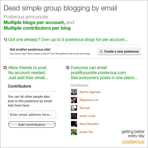 Today the company is announcing a new product, group blogs. You can add your friends or family’s email addresses to any Posterous site you control, and they can then email stuff in too. It’s useful for families, sports teams, etc. to share photos and video. Once you’ve added those emails, all they have to do to post is send whatever they want to publish to post@sitename.posterous.com. No registration required. An example is here, and see the image below.