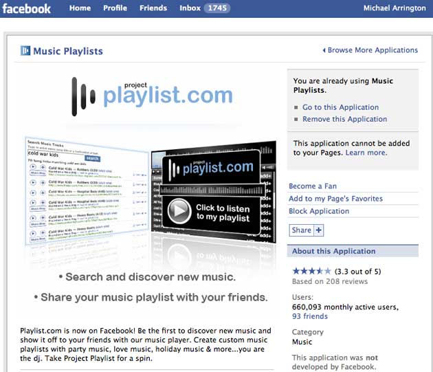 The entire application has been removed (it used to be here), and the embedded playlists have been removed from user’s profiles. An image of what the application used to look like is below. Over 660,000 Facebook users are affected.