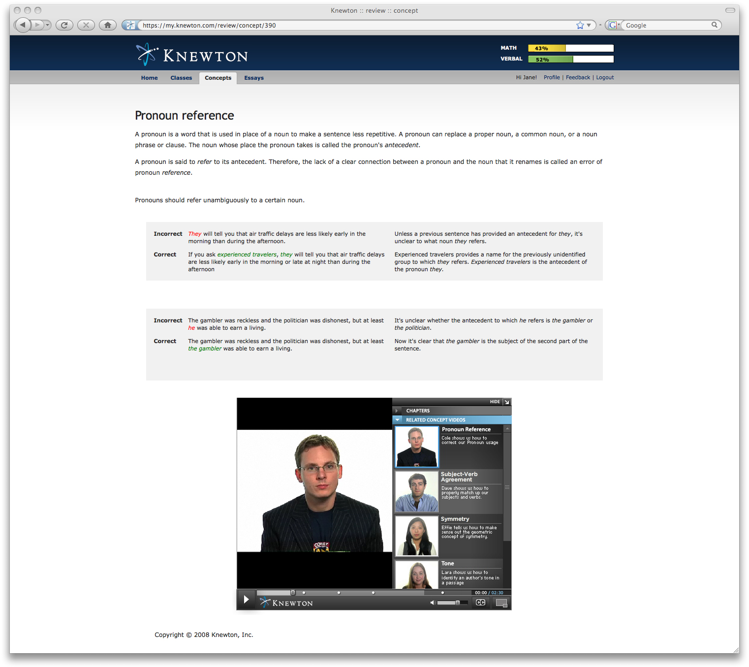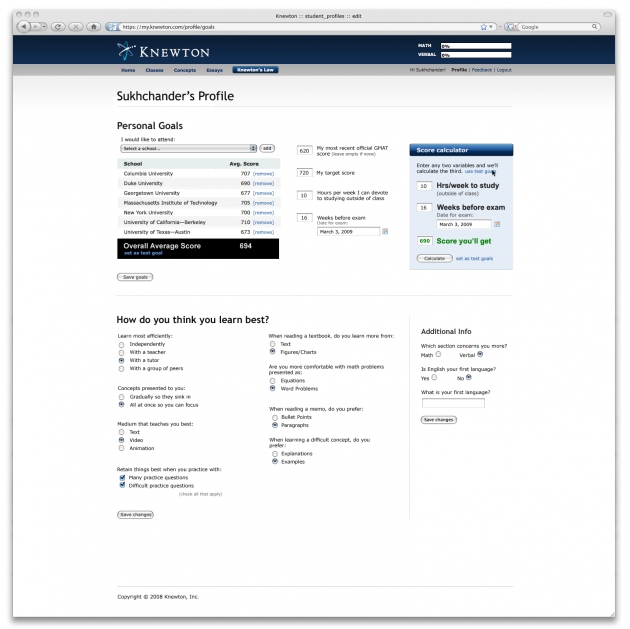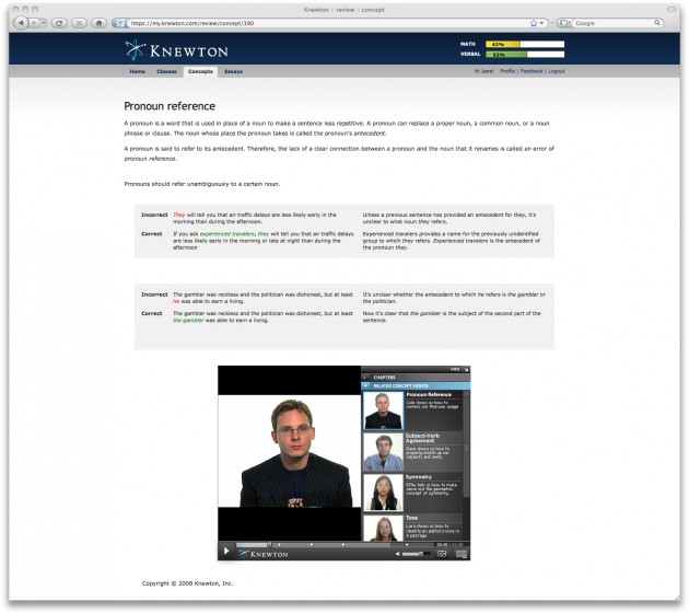 The service combines live video chat with an instructor in a whiteboard environment, along with learn-at-your-own-pace sample questions and tutorials. Knewton finds the best teachers it can get and pays them $500 to $800 an hour. In addition to the virtual classroom, Knewton keeps track of each student’s progress in mastering the thousand or so concepts that can be covered in each test. A “concept queue” keeps the students abreast of what concepts they have mastered and which ones they are weak on. They can click on each concept tag to dig deeper. (See screenshots below).
