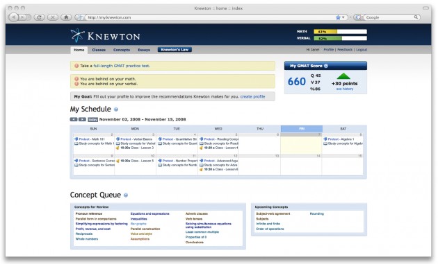 A color-coded progress bar tells them how they are doing in different categories such as math or verbal. Knewton also shows students what their score would be on the test if they took it that day, based on the questions they’ve actually answered. Students also receive alerts for upcoming classes, homework deadlines, office hours, and the like.
