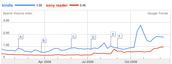 Not finding any available Kindles, searches for “Sony Reader” are picking up as well, although the clear preference is still the elusive Kindle by nearly two to one. If you really want one, just do yourself a favor and wait for the next version to come out early next year.