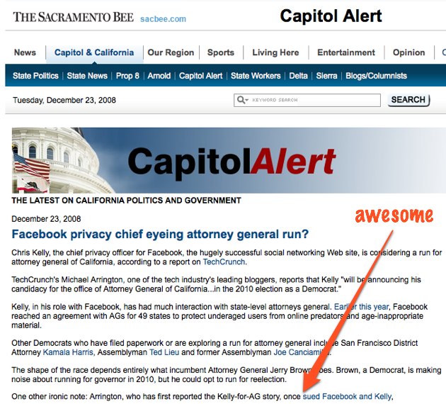The Sacramento Bee mentions our ongoing litigation with Facebook and our next Attorney General, Chris Kelly (which was actually settled later that April Fools Day).