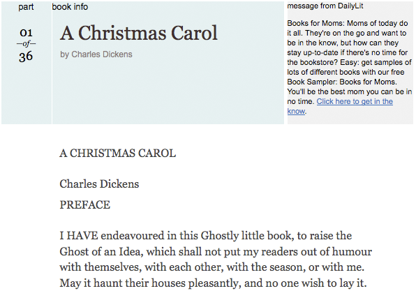 To use the site, you choose a novel from DailyLit’s catalog of over 1300 novels, many of which are free. Each book is broken up into dozens (or hundreds, depending on the length) of installments, each of which is supposed to take around 5 minutes to read. You can tell the site exactly what time you’d like to receive each update, which can be sent either via Email or in an RSS feed, and how many chunks you’d like to receive at a time. And if you just can’t wait to see what happens next, you can also immediately download the next section of a book using a link at the bottom of every Email.